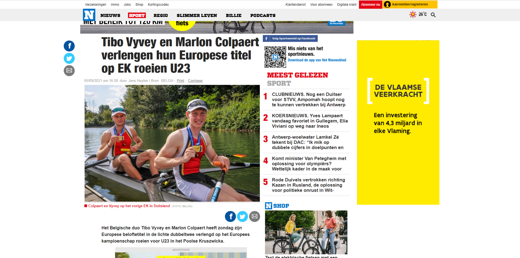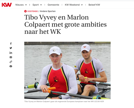 PERSARTIKEL: "Tibo Vyvey en Marlon Colpaert verlengen hun Europese titel op EK roeien U23"